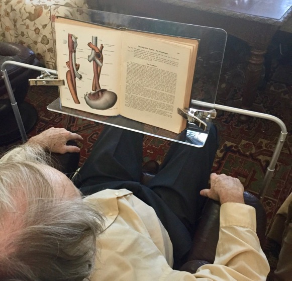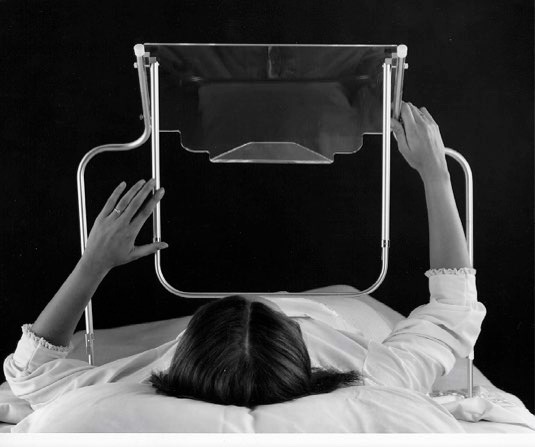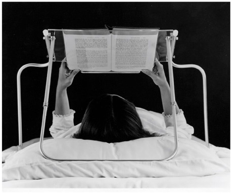 A stationary frame holds the book in a raised position above the reader. The book rests against a clear plastic surface, face down. The reader looks through the plexiglass to view the page. Ample room is provided for shoulder, head and arm movements. The Bed Reader adjusts to accommodate varying degrees of near or farsightedness; it may be used with or without glasses, and on varying degrees of bed tilt. The device folds automatically when raised. Strong, lightweight material is used throughout to create a unit of exceptional sturdiness, appropriate for children as well as adults.
