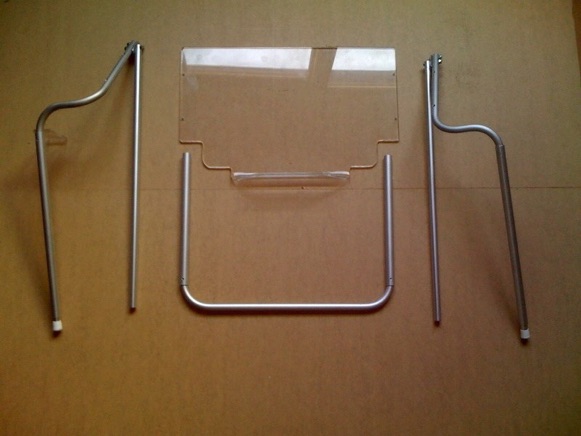 1. Line up each leg assembly in turn under the plexiglass lectern. Line up just one leg onto the plexiglass at a time. The bottom shelf of the plexiglass lectern must be facing up, and towards you (see picture just above). The aluminum legs go underneath the plexiglass (on the back side, opposite the shelf) and bend out (sideways) from each side of the plexiglass. The shorter part of each leg lines up with a side of the plexiglass. The bottom end of each leg has a white cap on it and should be down, in the same direction as the shelf. The bottom of each leg should also bend behind the plexiglass, away from the shelf. Make sure the two nuts on the top of each front leg are at the top of the plexiglass (opposite the shelf), and face out. If you do this you will make sure the legs are lined up correctly. Check these directions before going to step two. Remember, just line up one leg at a time.